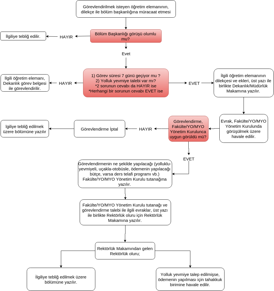| 1. | 2547 Sayılı Kanunun 39. Maddesi kapsamında 7 günden az ve yolluksuz/yevmiyesiz görevlendirme talebinde bulunacak Öğretim Elamanı bağlı olduğu Bölüm Başkanlığına en az bir hafta önceden talebini EBYS'den dilekçe ile bildirir. | Dilekçe | Görevlendirme Dilekçesi | İlgili Kişi |