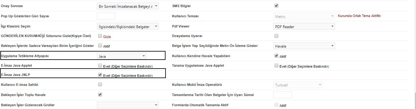 Kullanıcı Kartında Uygulama Tetikleme Altyapısı seçeneğinin Java seçilmiş ve E-İmza Java JNLP kutucuğunun işaretli olması gerekmektedir.