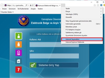 - İnternet Tarayıcınızın menü çubuğundan ‘Araçlar’ menüsünün alt menüsü olan ‘İnternet Seçenekleri’ seçilir.