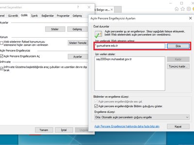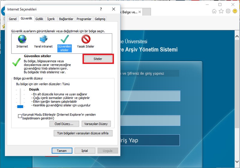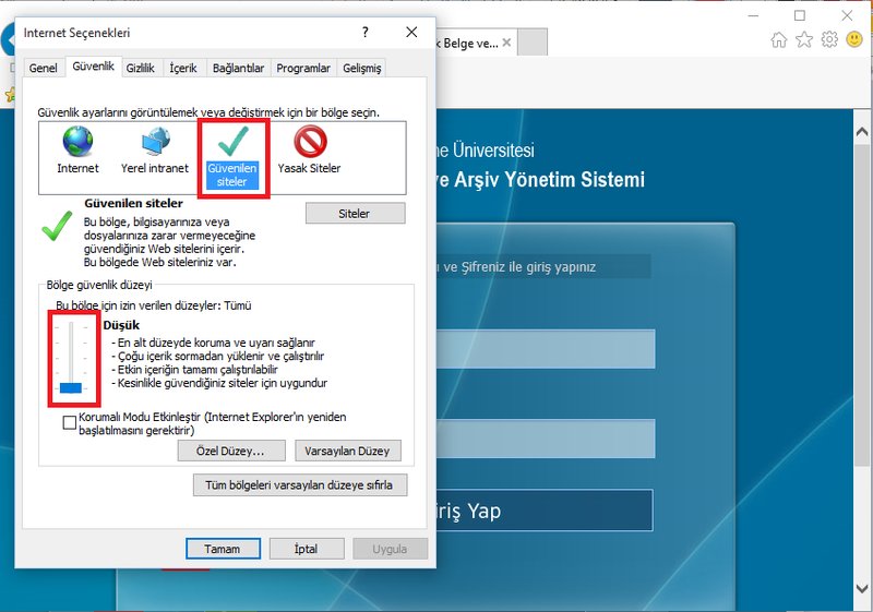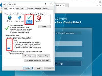- Programın çalışmasında güvenlik ile ilgili sorunlarla karşılaşılmaması için Bölge güvenlik düzeyinin düşük seviyeye çekilmesi gerekmektedir. Son olarak ‘Tamam’ ve ‘Uygula’ butonlarına basılarak işlem sonlandırılır.